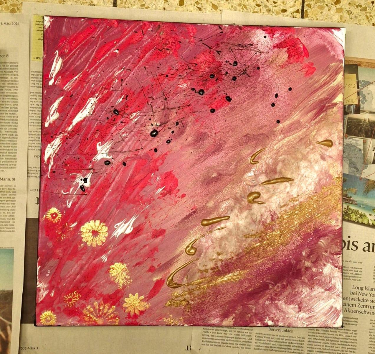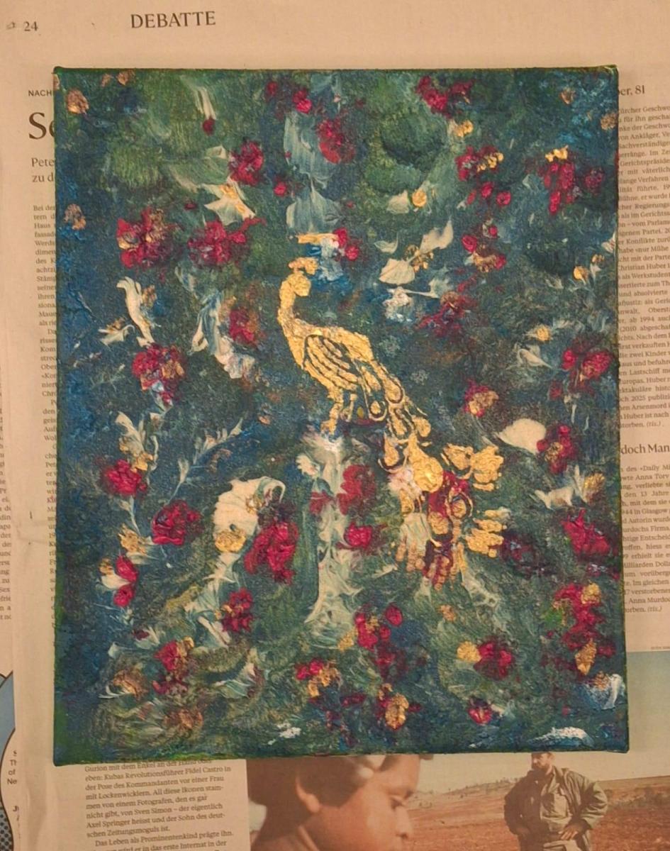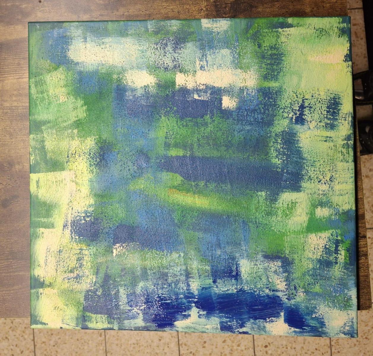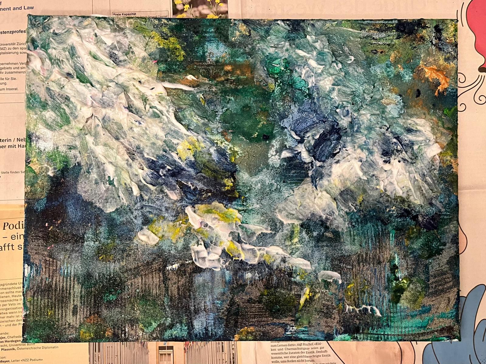 Ein Werk mit dominierenden Grüntönen und strukturierten Oberflächen zeigte eindrucksvoll, wie mit einfachen Mitteln Tiefe und Spannung entstehen kann. Ein anderes Bild überzeugte durch lebendige Farbexplosionen und spielerische Details.