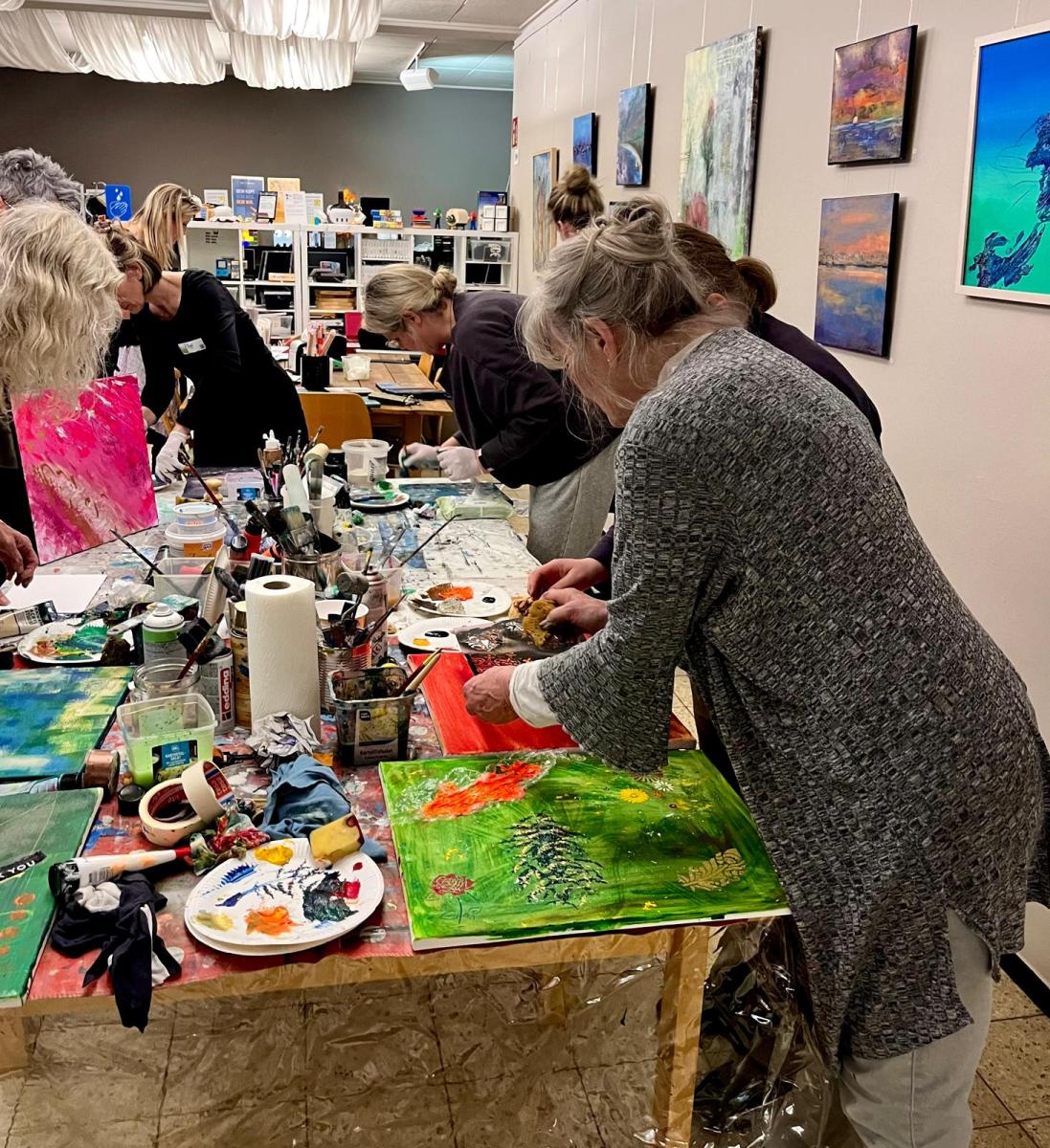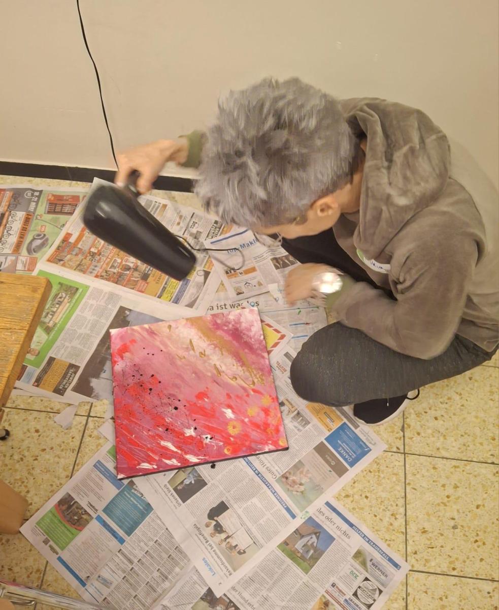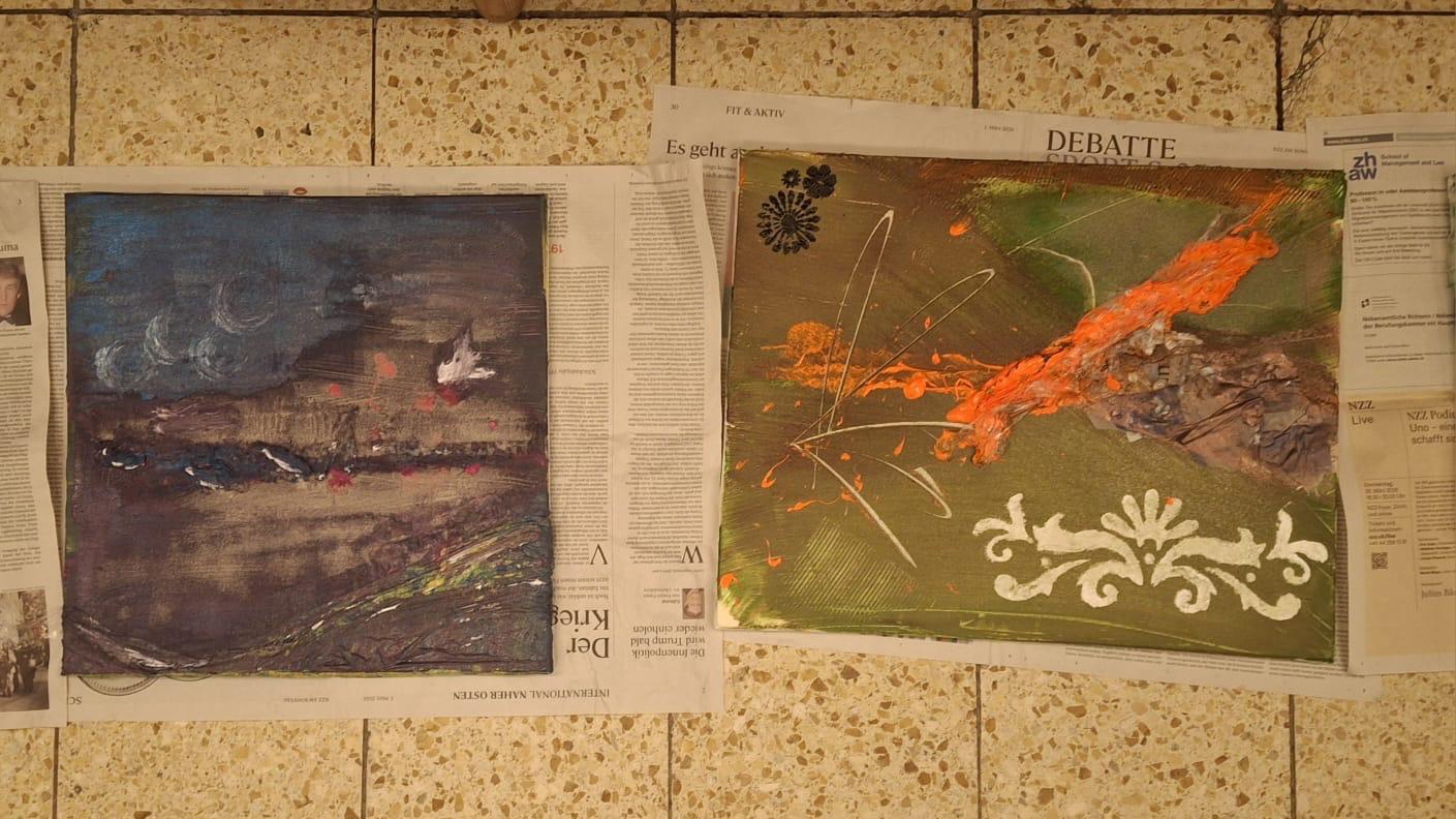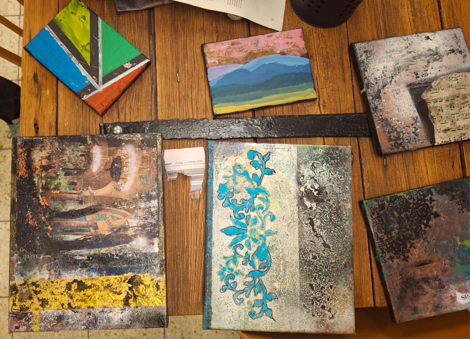 Schon beim Betreten des Raumes war klar: Hier geht es nicht um Perfektion, sondern um Ausdruck. Der große Arbeitstisch, übersät mit Farben, Pinseln, Spachteln, Sprays und unterschiedlichsten Materialien, lud sofort zum Experimentieren ein.