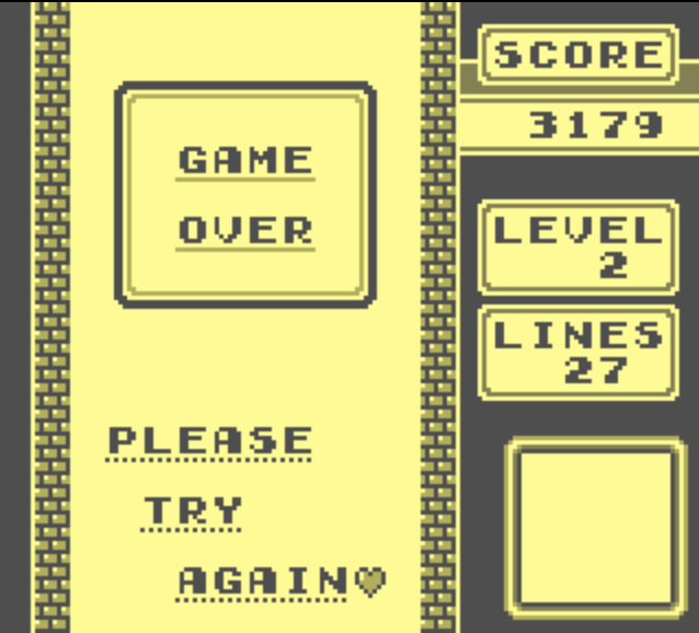 Zeig uns, wie weit du im 1-Spieler-Modus (A-Type) von Tetris auf dem Game Boy kommst! Melde deinen Highscore einfach mit einem Beweisfoto vom Handy per E-Mail an highscore@buefobude.de. Vergiss nicht, deinen Namen anzugeben, damit wir ihn hier veröffentlichen können. Ein Mitarbeiter wird deinen Namen, den Punktestand und das Datum in die Highscore-Tabelle eintragen. Schaffst du es, den Rekord zu brechen?